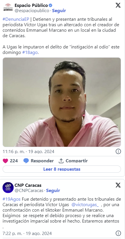 20-08-24.-La ONG Espacio Público denunció que el periodista Victor Ugas fue detenido arbitrariamente tras un "altercado" con el tiktoker Emmanuel Marcano.