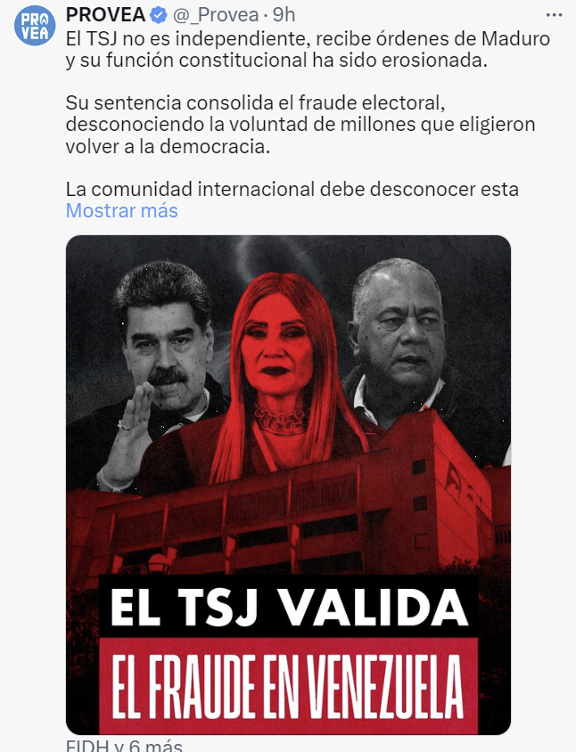 23-08-24.-La ONG Provea denunció este jueves que la sentencia del Tribunal Supremo de Venezuela (TSJ) ilegítimo consolida el fraude electoral en Venezuela e ignora la voluntad de millones de venezolanos que eligieron rescatar la democracia.