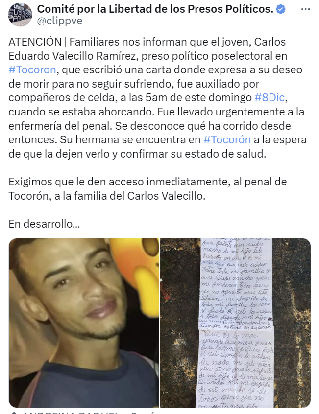 Esto luego de conocer que el joven de 29 años, oriundo de la parroquia Antímano de Caracas, intentó suicidarse la madrugada de este domingo 8 de diciembre y, tras ser asistido por algunos compañeros, fue trasladado a la enfermería de ese recinto carcelario.
