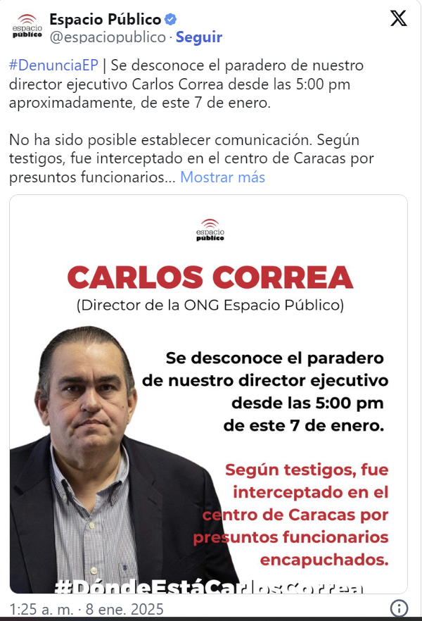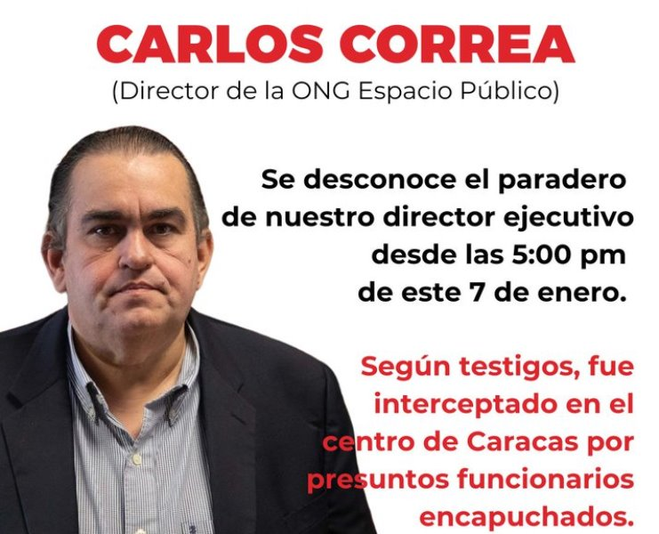 "Se desconoce el paradero de nuestro director ejecutivo Carlos Correa desde las 5:00 pm aproximadamente, de este 7 de enero. No ha sido posible establecer comunicación. Según testigos, fue interceptado en el centro de Caracas por presuntos funcionarios encapuchados", dijo la ONG.