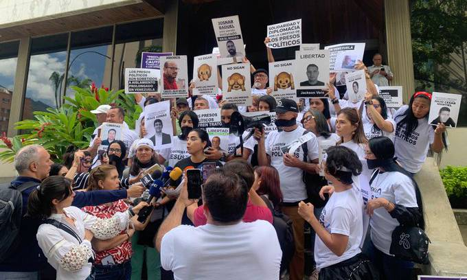 La actividad, organizada por la ONG Comité por la Libertad de los Presos Políticos, formó parte de la denominada ‘Ruta Global Por La Justicia’, un recorrido convocado por parientes y allegados de los detenidos por cinco sedes diplomáticas en Caracas, que arrancó este lunes en la legación de Colombia y concluirá el viernes en la representación de la Unión Europea (UE).