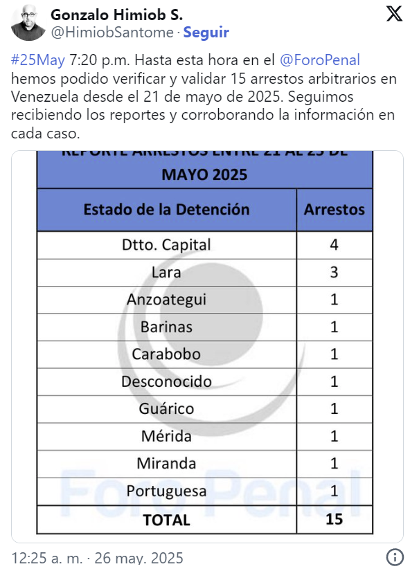 «7:20 p.m. Hasta esta hora en el Foro Penal hemos podido verificar y validar 15 arrestos arbitrarios en Venezuela desde el 21 de mayo de 2025. Seguimos recibiendo los reportes y corroborando la información en cada caso», dijo el activista por los derechos humanos, en sus redes sociales.