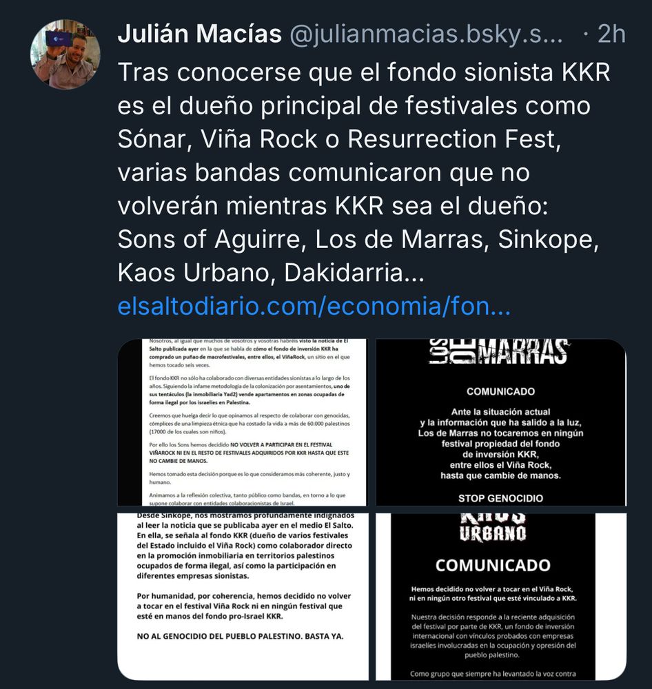 La promotora Superstruct, participada mayoritariamente por KKR, gestiona festivales como el Sónar, Arenal Sound, Resurrection Fest, O Son do Camiño o FIB Benicássim. En las últimas semanas, numerosos grupos y artistas han decidido cancelar sus actuaciones en protesta por el vínculo con el fondo, al que acusan de financiar, directa o indirectamente, el despojo de suelo palestino a través de operaciones inmobiliarias.