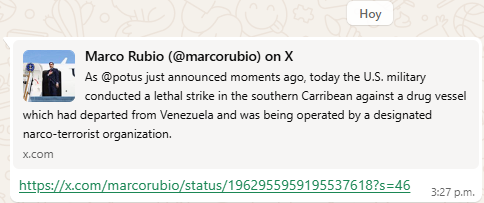 El secretario de Estado, Marco Rubio, expresó en la red social X que la embarcación estaba siendo operada por una "organización designada como narco-terrorista".