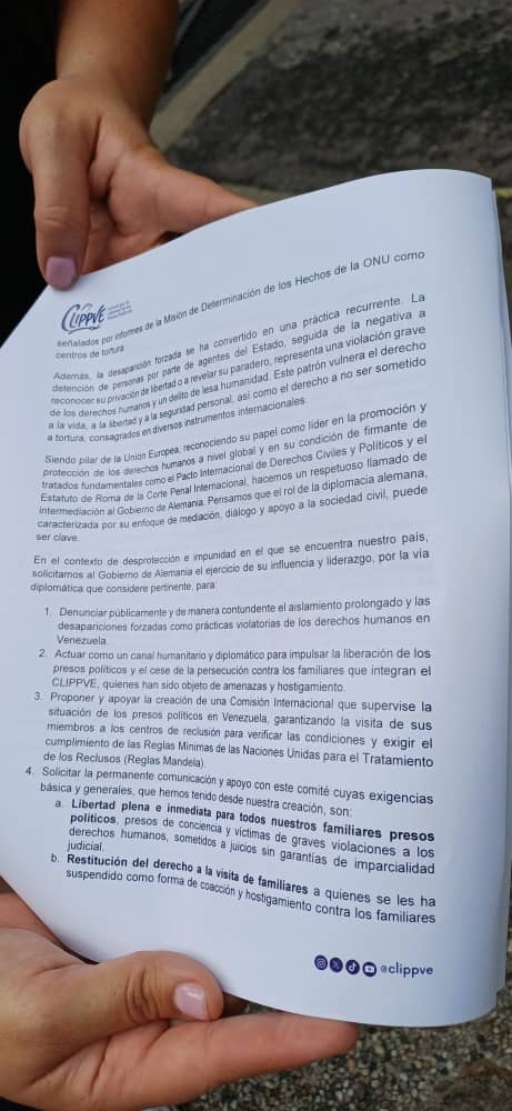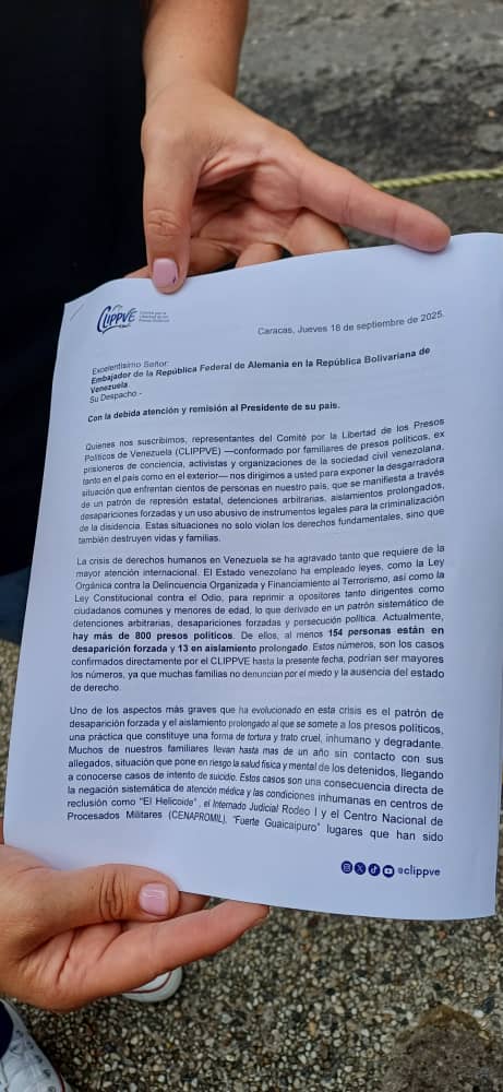 Las cartas entregadas el lunes en la Embajada de España, el martes en la Embajada de Suiza y este jueves en la Embajada de Alemania explican que en Venezuela «hay más de 800 presos políticos», 13 de los cuales están «en aislamiento prolongado».