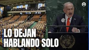Benjamín Netanyahu, fue recibido con abucheos al comenzar su discurso este viernes durante la Asamblea General de la ONU, luego muchas delegaciones comenzaron a abandonar el espacio. La situación requirió la intervención del presidente de la Asamblea General, quien golpeó el mazo para llamar al orden, sin embargo las delegaciones hicieron caso omiso y continuaron abandonando el hemiciclo, dajando practicamente solo al gobernante genocida.