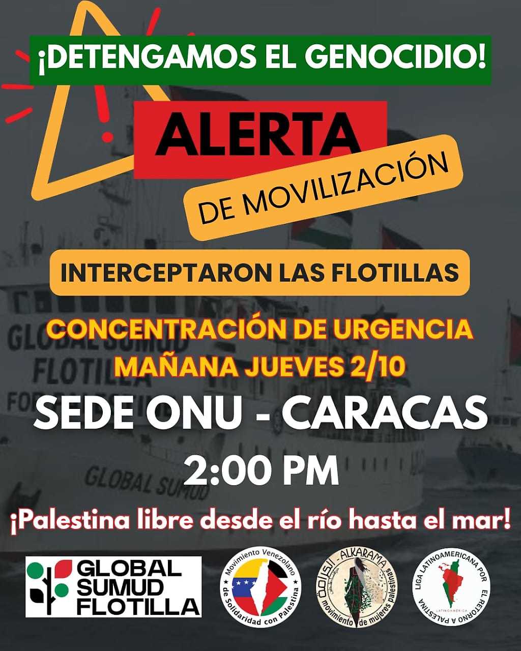 La Plataforma Internacional de Solidaridad con la Causa Palestina, atendiendo el llamado de los y las integrantes de la Flotilla Sumud, interceptada por el régimen terrorista, ente de ocupación que comete Genocidio contra el pueblo de Palestina, se une a la convocatoria a la Concentración frente a la sede de la ONU, Torre Ávila en Altamira. Jueves 2 de octubre, Hora: 2:00 pm