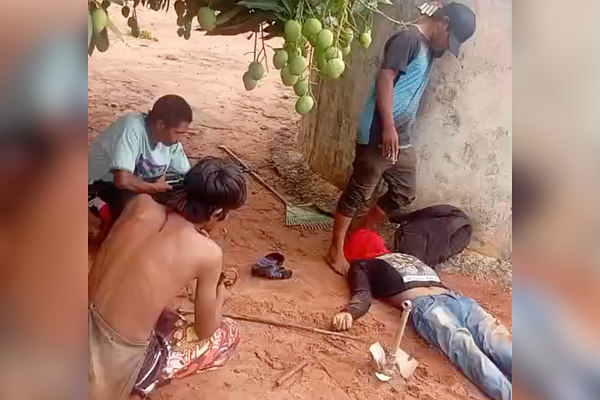 Así quedó el cuerpo del líder indígenaVicente Fernandes Vilhalva quien yace en el suelo rodeado por sus compañeros guaraní-kaiowás.