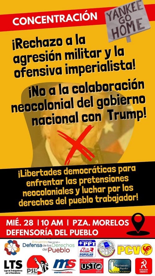 Caracas, 28 de enero de 2026.- Con la presencia de algunos militantes y activistas, militantes y transeúntes, se llevó a cabo la actividad convocada para hoy miércoles 28 de enero por un conjunto de organizaciones de la izquierda opositora al gobierno venezolano y a la intervención imperialista. Consistió en una concentración en la plaza Morelos, con visita colectiva a la Defensoría del Pueblo (ubicada en el mismo lugar), como acción de protesta en "¡Rechazo a la agresión militar y la ofensiva imperialista!" , diciendo "¡No a la colaboración neocolonial del gobierno nacional con Trump!" y exigiendo "¡Libertades democráticas para enfrentar las pretensiones neocoloniales y luchar por los derechos del pueblo trabajador!".