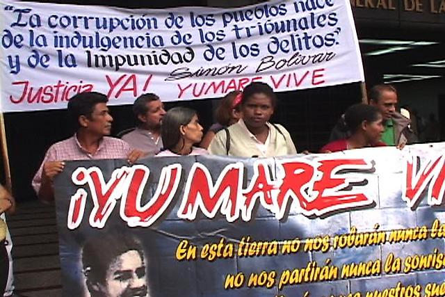 En la mañana de hoy 14 de diciembre de 2006, los sobrevivientes y familiares de las victimas de la Masacre de Yumare, acompañados de un nutrido grupo de amigos y de medios alternativos y comunitarios, se concentraron en la puerta de la Fiscalía General pidiendo justicia y celeridad en la investigación del caso que fue reabierto por un tribunal del Estado Yaracuy.