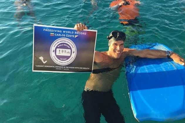 13-09-16.-El apneísta venezolano Carlos Coste sigue cosechando éxitos, el pasado fin de semana acumuló un nuevo record mundial a su larga lista: 177 metros con un sola bocanada de aire en aguas abiertas, la marca anterior fue alcanzada por el mismo Coste en noviembre del año 2010 sumergiéndose 150 metros. Los resultados serán remitidos a Londresdonde se encuentra ubicada la organización de los Record Guiness para recibir la certificación final.