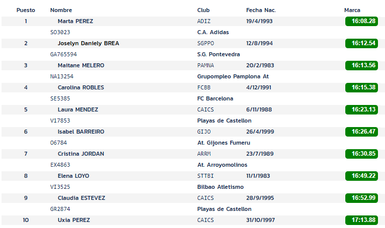 En ese sentido, el segundo y tercer lugar sobre el podio lo ocuparon Maitane Melero (16:13.56) y Carolina Robles (16:15.38).