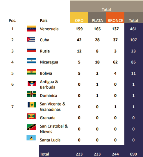 Venezuela encabeza el medallero en este evento deportivo con las épicas victorias de los hermanos Limardo en esgrima, la medalla de oro del equipo de ajedréz, así como la medalla de Julio Mayora en pesas, la de Yorhelis Salazar en Karate y María Victoria Yegres en natación, entre muchos grandes atletas nacionales que obtuvieron medallas de oro en estos V Juegos del Alba 2023 y que llenan de orgullo al pueblo venezolano.
