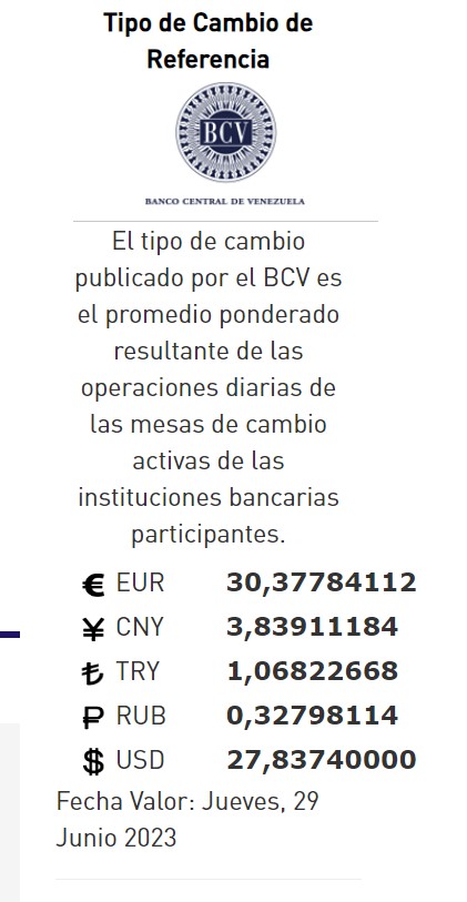 29-06-23.-El precio del dólar en el Banco Central de Venezuela (BCV)se cotizó este lunes 28 de junio 2023  en Bs. 27,83 por unidad según la última actualización en su página web oficial y redes oficiales.