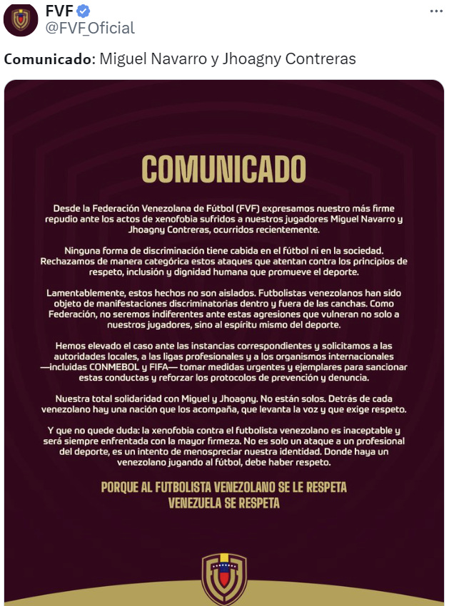 «Lamentablemente, estos hechos no son aislados. Futbolistas venezolanos han sido objeto de manifestaciones discriminatorias y fuera de las canchas. Como Federación, no seremos indiferentes ante estas agresiones que vulneran no solo a nuestros jugadores, sino al espíritu mismo del deporte», señaló la FVF en un comunicado.