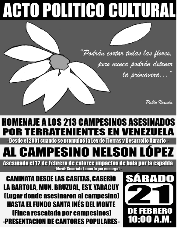 Nos convocamos hoy 21-02-2009 a las 10:00 AM, en la comunidad de la Bartola del Municipio Bruzual, para rendir honor post mortem, al Camarada Campesino Nelson López. Cuando hablamos de Justicia, significa acabar con la impunidad, exhortamos a la Fiscalia General de República, a las Policías Científicas, CICPC, DIM, DICIP, y a los Tribunales correspondientes que en la construcción del socialismo por mas ricos que sean los autores intelectuales y ejecutores, de conductas de sicariatos y paramilitarismo la justicia se impondrá en le ejercicio de la construcción del Poder Popular.