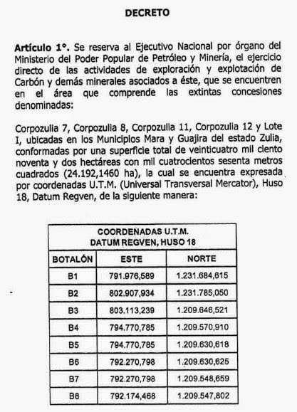 El Gobierno, mediante Decreto Presidencial 1.606 publicado en Gaceta Oficial 40.599 del 10/02/2015 autoriza explotar 5 lotes de carbón que según las coordenadas UTM Datum WGS-84 señaladas en Mapas Topográficos 5748 y 5749 en 1:100.000 van desde Monte de Oca Sierra de la Majayura al Norte lindero natural con Colombia hasta la margen norte del río Socuy.