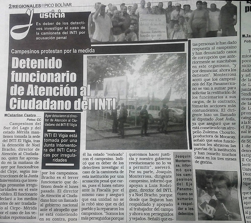 | Publicación de prensa que reseña la detención de Noel Bracho del INTI El Vigía |