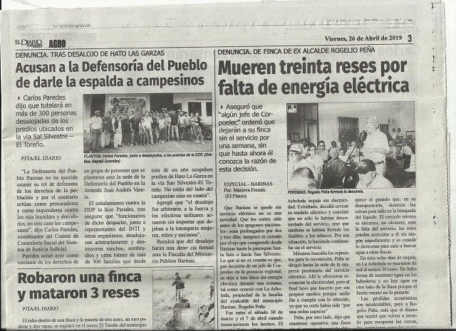 Diarios exponen la denuncia de los hechos pero los campesinos dicen que las instituciones actúan para intereses que no son los del pueblo ni se corresponden con una "revolución" Credito: Prensa CCSSJJ |