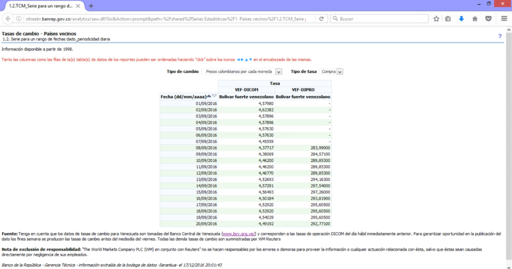 Lo que llama poderosamente la atención, es que a partir de septiembre de 2016 el Banco de la República de Colombia comenzó a publicar y a utilizar el DIPRO como tipo de cambio para calcular la cantidad de pesos que entregaría por cada bolívar. Es así como en lugar de seguir entregando 4,55 pesos por bolívar, comenzó a entregar 287,93 pesos/Bs (en ese momento el tipo de cambio dólar-peso era 2.933,82 pesos/US$). La siguiente imagen muestra lo aquí señalado.