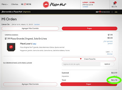 Ahora bién: Según la página oficial de Pizza Hut (www.pizzahut.com), puedo comprar una pizza grande en Estados Unidos por 11,76 dólares.