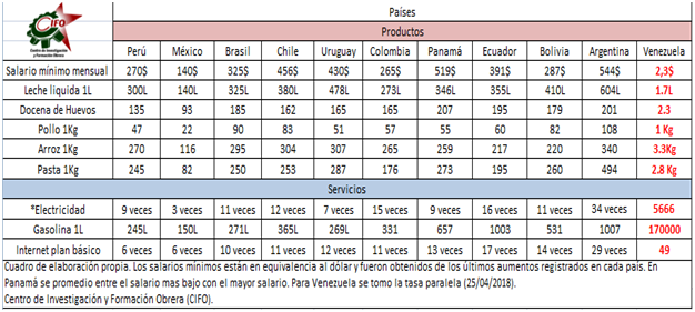 Observamos como el salario mínimo en Venezuela es el más bajo (dólares) y el que con menos se puede comprar alimentos, además se muestra la evidente distorsión en las tarifas públicas y lo sobrevalorado que se encuentra el precio de la gasolina. Esta la hiperinflación hace estragos en la sociedad venezolana y con un ritmo tan acelerado que se proyecta como unos de los casos de hiperinflación mas grave de la historia contemporánea mundial.