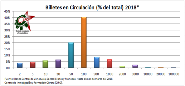 El efectivo o “cash” es un problema que en hiperinflación es común, debido a que los precios son tan elevados que se requieren de mucho billetes para adquirir un producto, totalmente contrario a lo que dice la Sra Pascualina Curcio que es por esa razón que el gobierno emite mas oferta monetaria y “ayudar” al pueblo o que los billetes los contrabandean hacia Colombia, creemos que confunde causa con efecto. En el grafico 2 observaremos en porcentajes las cantidades de billetes que existen por cada denominación que actualmente circula en el país.