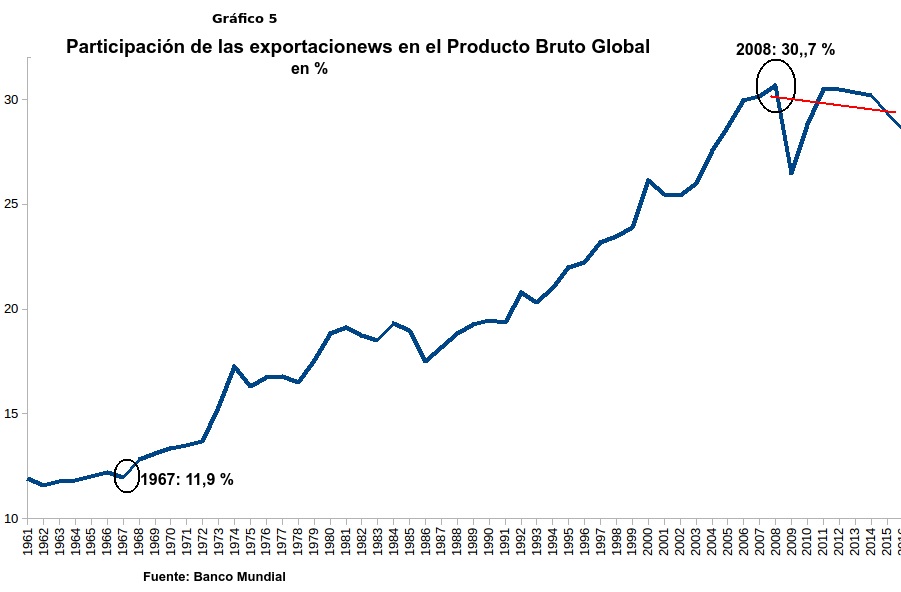 La tan publicitada globalización comercial, maravilla neoliberal que se expandía quebrando tejidos sociales y acumulando desocupación y pobreza llegó a su máximo en 2008 cuando las exportaciones representaban el el 30,7 % del Producto Bruto Global (en 1963 llegaban al 11,7 %), entonces dejó de crecer e inició el camino descendente (Gráfico 5).