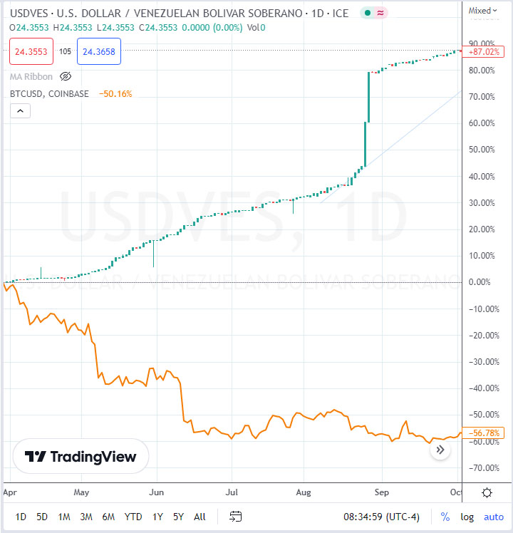 En la gráfica adjunta, se puede apreciar la correlación negativa entre la cotización de bitcoin (línea naranja) y el precio del dólar en la tasa que publica el BCV. A partir de abril de 2022, se aceleró la caída de bitcoin y al mismo tiempo, a partir de mayo, se aceleró la subida del dólar en Venezuela. El aumento del dólar se aceleró en agosto, después del pago de bonos a trabajadores de la administración pública, por parte del gobierno venezolano. Ese mes aceleraron la inyección de bolívares, en un mercado seco de divisas y con bitcoin en caída.