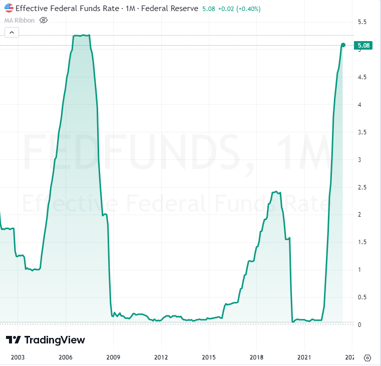 El alza de tasas de interés de EEUU, entre 2022 y 2023, es más agresiva que el aumento en 2006, dos años antes de la crisis hipotecaria. El alza de las tasas de los fondos federales todavía no encuentra un techo y se espera que para el próximo 26 de julio se aumenten a 5,50 %, lo que podría provocar nuevas caídas en los mercados de riesgo y golpear las economías de los países emergentes.