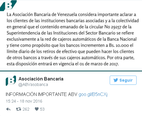 20 dic. 2016 - La Asociación Bancaria de Venezuela (Asobanca) aclaró este viernes que, a partir del 1 de marzo de 2017, los tarjetahabientes podrán retirar en cajeros automáticos de otros bancos hasta 10.000 bolívares.
