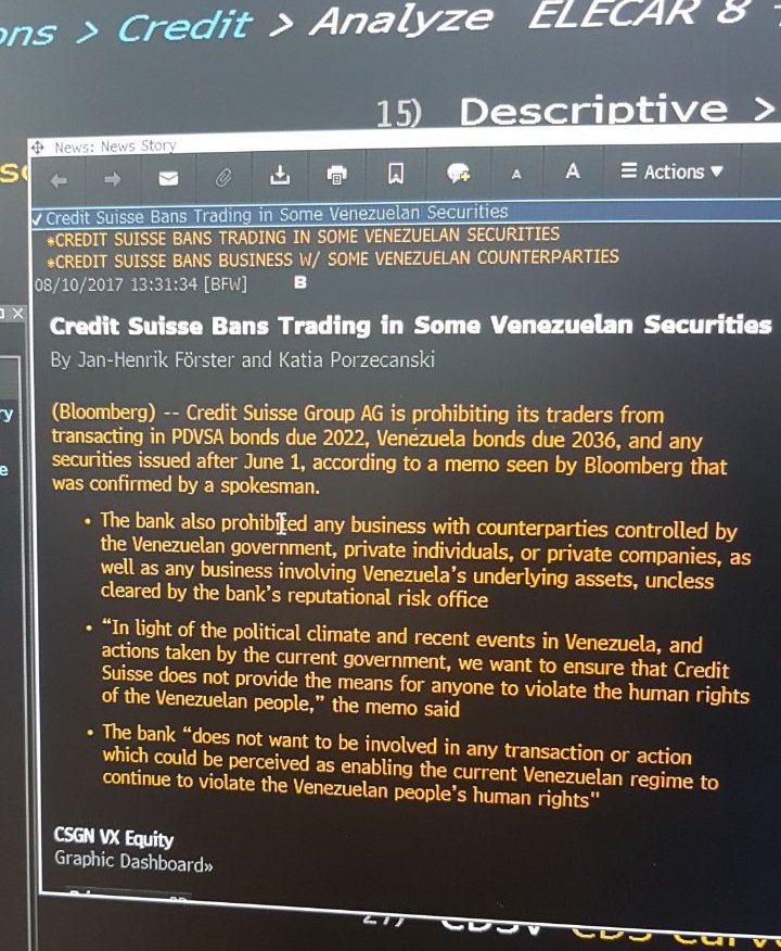 Banca de inversión Credit Suisse prohíbe a sus unidades transar algunos títulos venezolanos por riesgo reputacional: documento interno pic.twitter.com/IqqVU8YxXZ