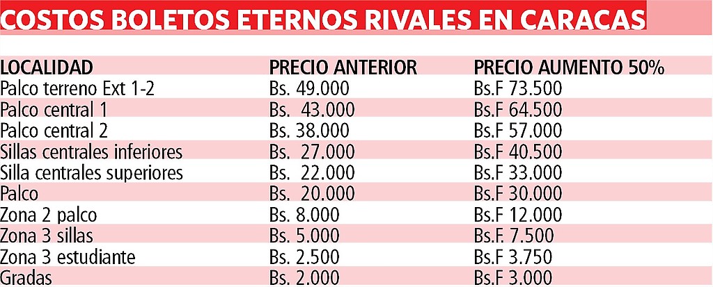 Los eternos rivales han disputado tres juegos en Caracas con promedio de 20 mil aficionados por fecha y tres en Valencia con 14 mil personas por partido. El incremento de precios de la boletería no aplica para los abonados durante el calendario de eliminatoria.