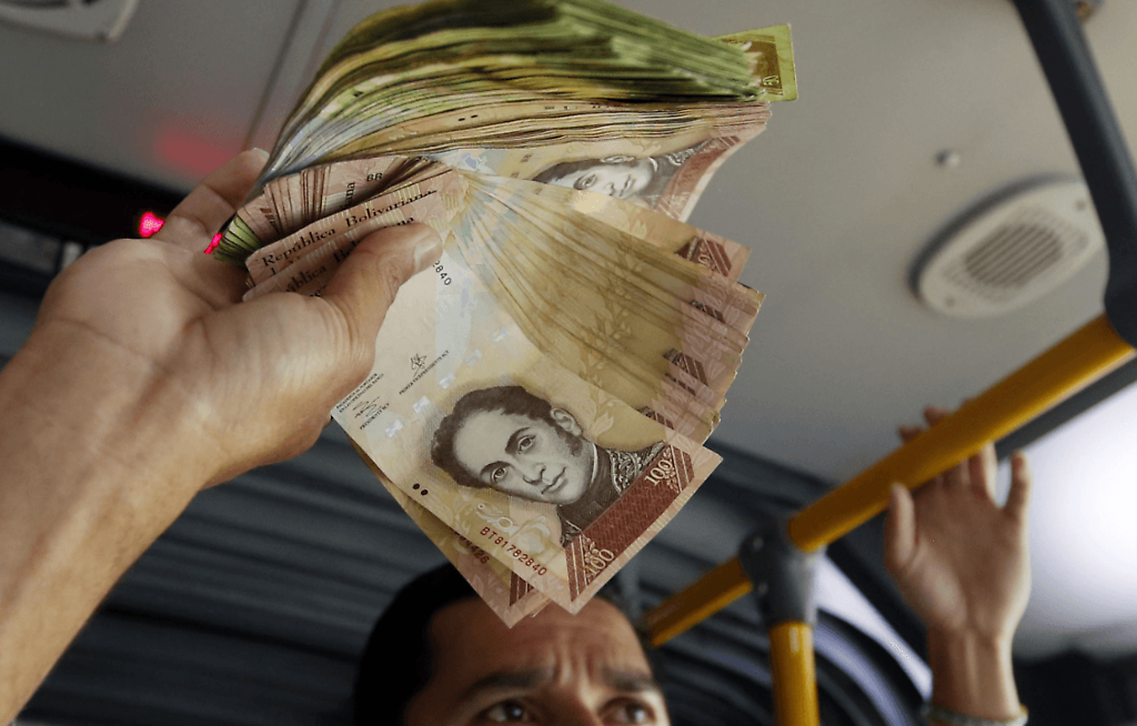 Este hombre de 32 años repite enérgico la frase cada vez que se sube al transporte, decenas de veces durante ocho horas al día en Bogotá, y saca un fajo de bolívares, la moneda de Venezuela.