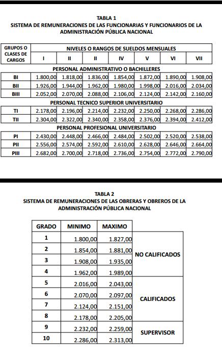 El sueldo base se fijó en 1.800 bolívares mensuales, que es el monto que tendrá el personal administrativo o bachilleres (BI tipo I). El valor cambia dependiendo del nivel o rango del cargo, para los bachilleres BII tipo I la remuneración se ubica en 1.926 BsS (Bs 192,6 millones de BsF) y progresivamente hasta los 2.034 BsS (203,4 millones BsF) para los BII tipo VII.