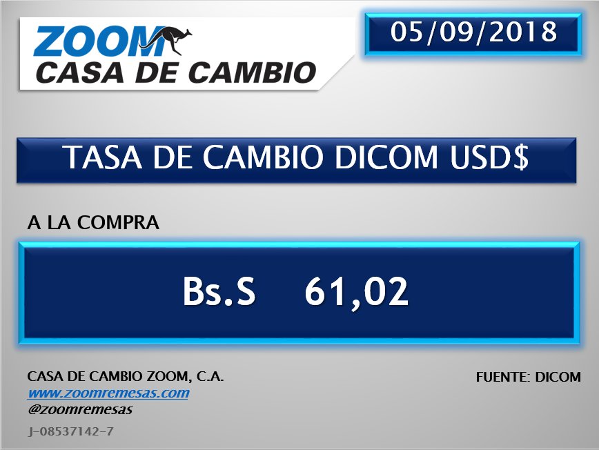 A partir del #05Sep Casa de Cambio ZOOM cuenta con una tasa de Bs.S.61,02 Recibe tu dinero de manera rápida, segura y confiable. Visítanos en https://t.co/l1JbWWC10L pic.twitter.com/VGrot8UgYP