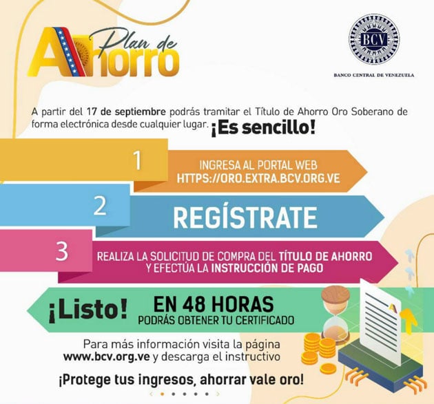 17 sept. 2018 - El Banco Central de Venezuela informó que a partir de este lunes 17 de septiembre se podrá tramitar el Título de Ahorro Oro Soberano vía electrónica.