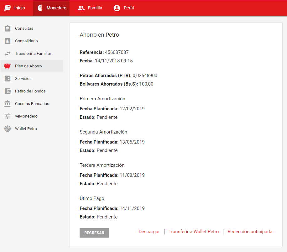 En Monedero, opción Plan de Ahorro, en Ver Ahorros buscar los detalles de alguna operación realizada antes del 31 de diciembre de 2018, al final aparece la opcion Tranferir a Wallet Petro.