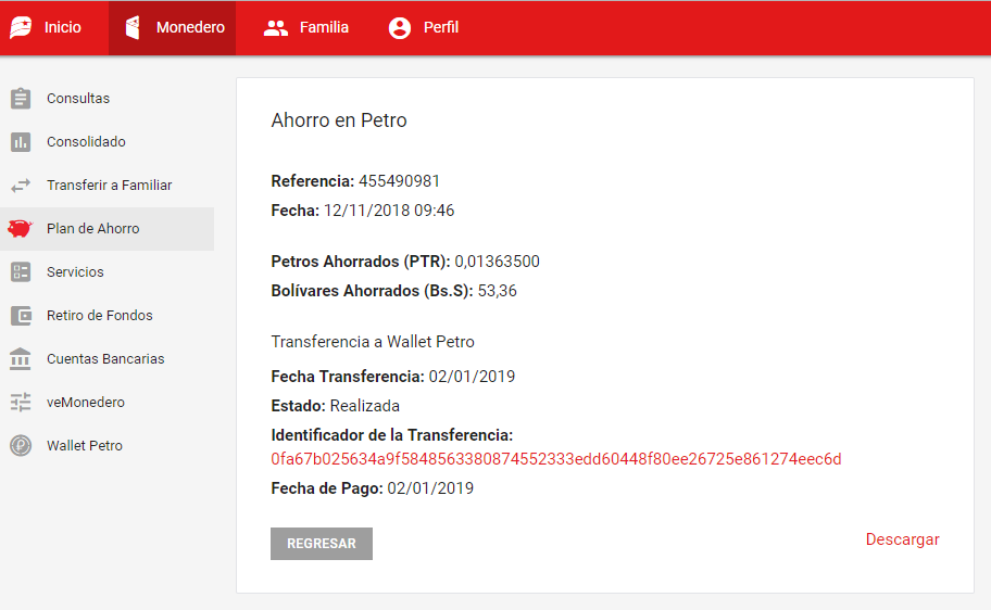 Después de realizada la transferencia al Wallet Petro, en la descripción del ahorro se mostrará el identificador de la transferencia con un enlace al explorador del Petro como confirmación.