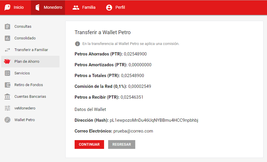En Transferir a Wallet Petro se muestran los detalles de la transferencia para que sea confirmada.