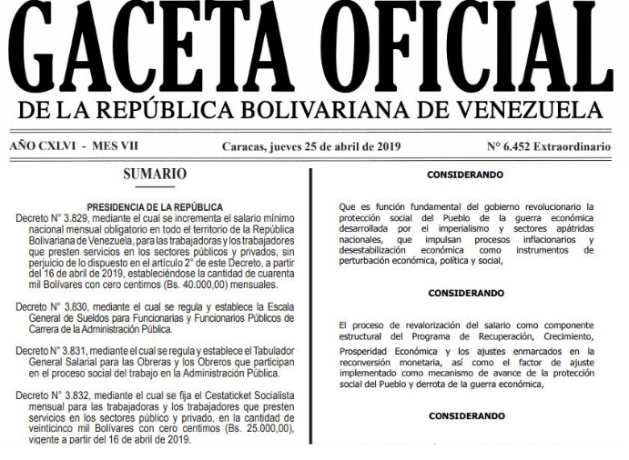 Queda establecido, según el decreto 3.829, un aumentó del salario mínimo para todos los trabajadores y trabajadoras del sector público a nivel nacional de Bs 40 mil soberanos, y de acuerdo al decreto 3.832, también se establece un incremento en el bono alimenticio de 25mil soberanos.