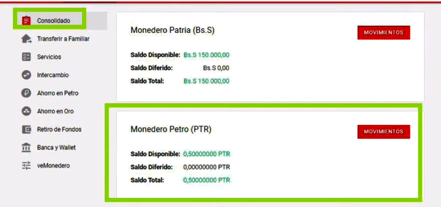 Paso 2: Pulsa «Consolidado», en la pestaña superior a la izquierda y verás la pantalla donde te mostrará el Monedero Petro con la indicación de que tu saldo disponible es de 0,5 PTR (petros).