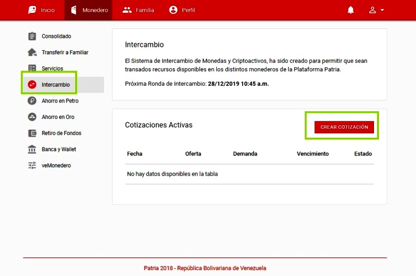 Paso 3: Luego pulsa la sección de «Intercambio», la cuarta en tu barra de menú a la izquierda. Allí pulsas de nuevo en la recuadro que te aparece en color rojo de «Crear cotización». Esta opción es para intercambiar el medio petro o fracciones de éste por bolívares.