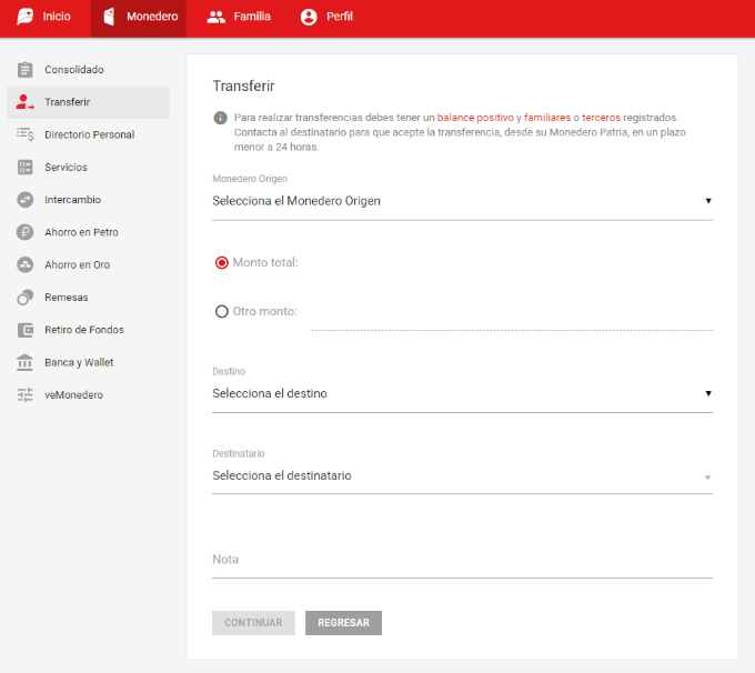 En el proceso de actualización de la Plataforma Patria, fueron unificadas en la sección Monedero las opciones de «Transferir a Familiar» y «Transferir a Tercero» en la opción «Transferir».