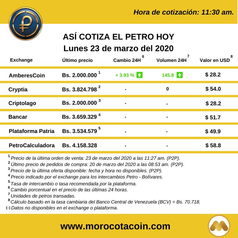 Ver nota completa en: https://www.morocotacoin.com/2020/03/petro-bajo-en-plataforma-patria-subio-en-exchange-lunes-23-de-marzo-2020/