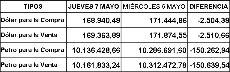La tasa oficial del dólar y el petro para hoy  Jueves 7 de Mayo de acuerdo al Banco Central de Venezuela: