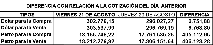 Ver Dólar y Petro del Jueves 20 de Agosto: https://www.aporrea.org/economia/n358118.html