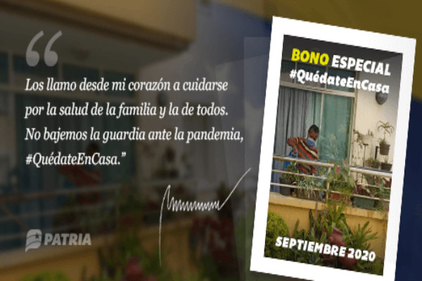 17.09.20 - La Plataforma Patria por instrucción de la presidencia de la Rep{ublica inició este 17 de septiembre de 2020 la entrega del Bono Especial #QuedateEnCasa (septiembre 2020), para los trabajadores independientes o cuenta propia, que hayan reportado esta condición a través de la opción Laboral y se verifique que no existe relación de dependencia con alguna entidad pública, privada o mixta.