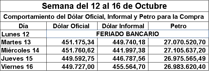 Ver Dólar y Petro del Jueves 15 de Oct.: https://www.aporrea.org/economia/n359618.html