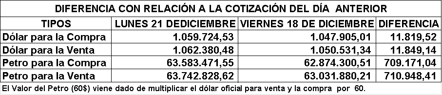 Ver Dólar y Petro del Viernes 18 Dic.: https://www.aporrea.org/economia/n361401.html